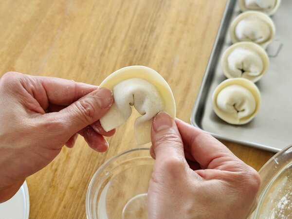 生地の真ん中に16等分した2を置き、皮のフチに水をつけ二つ折りにする。