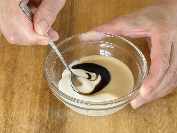 【ソース】の材料全てを混ぜ合わせ、器に入れ、最後にラー油を注ぐ。