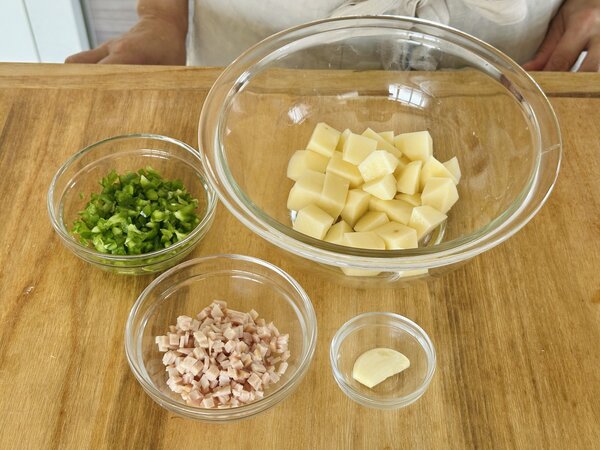 じゃがいもは皮をむいて2cm角に切り、にんにくと一緒に水から柔らかくなるまで茹でて、お湯を切っておく。