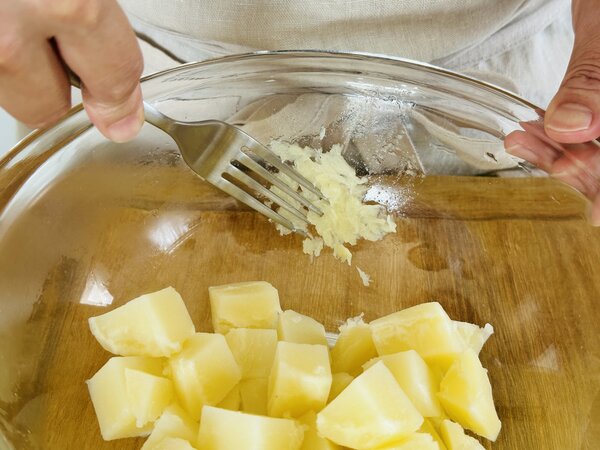 1のじゃがいもとにんにくをボウルに移し、先ににんにくをフォークなどで細かく潰す。