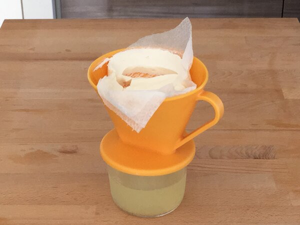 コーヒードリッパーに、フィルターをセットして、小岩井 生乳(なまにゅう)100%ヨーグルトを3時間ほど水切りして、ドリップ(水切り)ヨーグルトをつくる。