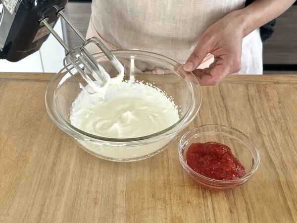 ボウルに生クリームを入れ、泡立て器で8分立てにし、いちごジャムを加えしっかり混ぜる。