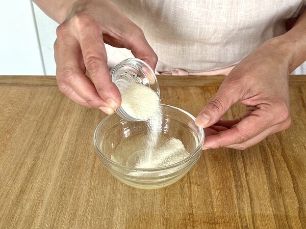 小さめの耐熱容器に、1のドリップ(水切り)ヨーグルトで出た「ホエイ」を入れゼラチンを振りいれ、ふやかす。